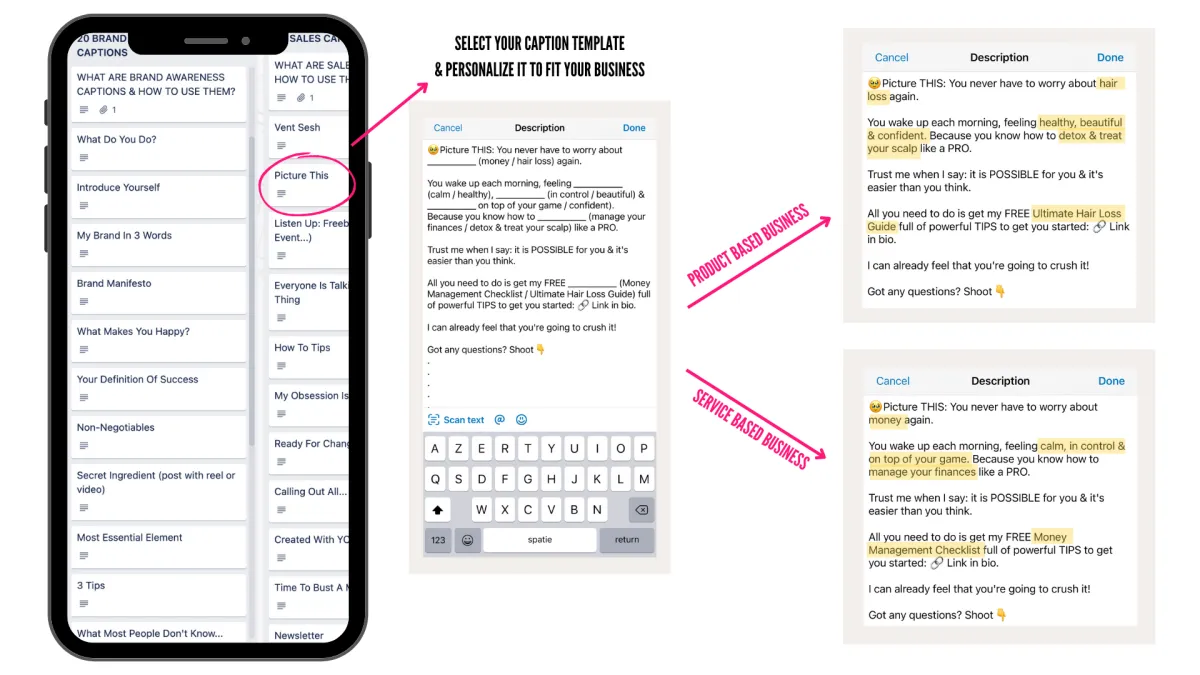 Caption Jungle works for both product- and service based businesses. Whether you're a coach, creative, service provider, or selling physical products, the caption templates are flexible and easy to adapt to what YOU offer and how you want to show up online. No complicated tech, skills or strategy required.