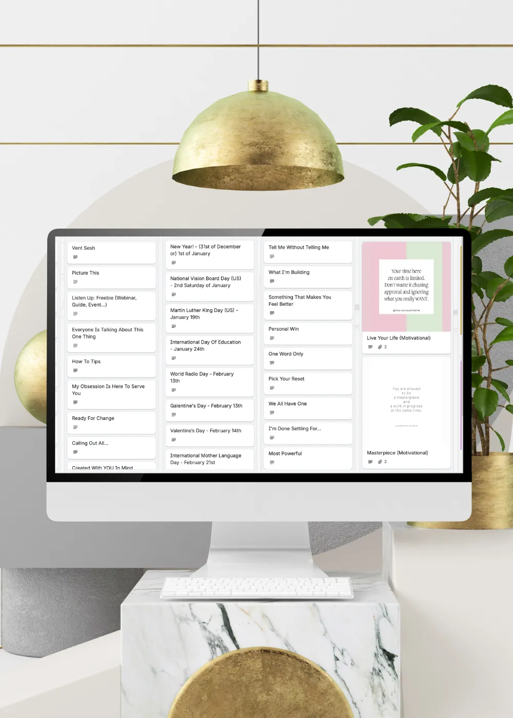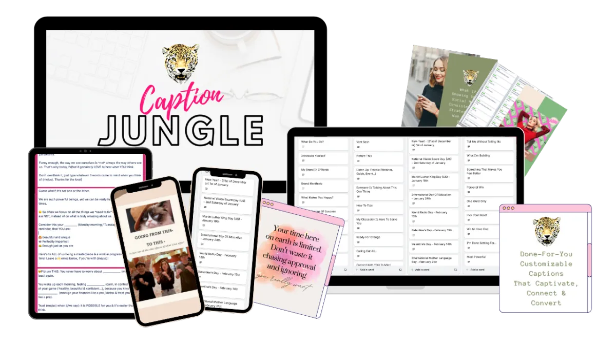 If you prefer a more visual and organized layout, you can also use Caption Jungle in a Trello board. It’s free to use, flexible, and perfect for working on the go. The bonuses can simply be personalized and downloaded from Canva.